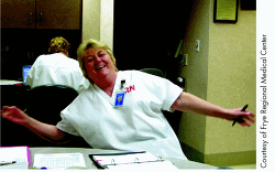 According to Cassaundra Hefner, BSN, RN, nursing director of the rehabilitation center restorative care unit, the scrub tops were so well received that "White Out Wednesdays" have been held weekly and employees will wear them for the entire Nurses' Week (May 6-12). As for patients and families, "They just love it," Hefner says. "I've had families tell me it's so nice to be able to see who the nurses are." Patches may be ordered in bulk from Valley Products Company, (800) 451-8874 or [email protected].