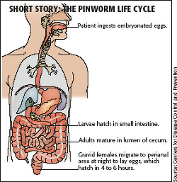 Small (2 to 13 mm) and white, adult pinworms live in the cecum. At night, gravid females migrate to the anus to lay eggs in perianal skin folds. The eggs usually hatch within hours. (See Short story: The pinworm life cycle.)