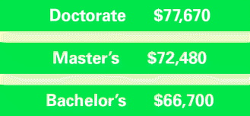 Respondents fared somewhat better when it came to education and compensation. There was more than a $30,000 difference in average salary between those with a diploma and those with a doctorate degree ($47,130 and $77,670 respectively). This advantage was less pronounced between other educational levels. The difference between a bachelor's and master's degree was less than $6,000 ($66,700 and $72,480 respectively), and the gap narrowed to $5,200 between those with a master's degree and a doctorate degree ($72,480 and $77,670, respectively).