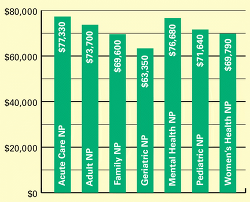 Other factors in addition to experience and education affected earning power. According to one NP who worked in acute patient care, most of her RN colleagues are eligible for night/weekend differentials and time-and-a-half overtime pay. As a salaried NP, she is not eligible for either, and the RNs fare better financially with this arrangement. The 1.4% of NPs who practice in the neonatal specialty earn the highest average annual salary ($79,000), which is approximately $10,000 more than that earned by the majority of NPs in family practice (48.8%).