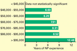 Experience was only partly rewarded with higher compensation. Those who had been NPs for more than 20 years earned an average salary of $77,460 compared with $67,850 for those with 1 to 2 years of experience. However, this amounts to a "reward" of less than $10,000 for nearly two decades of experience.