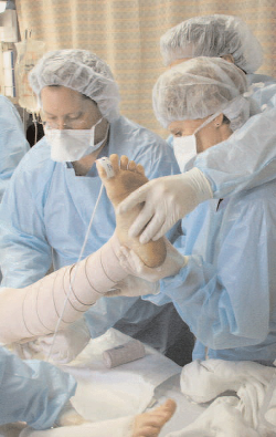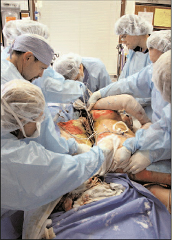 In February 2005, Roger Tuttle and six other photographers, the Documentary Group, spent nearly 24 hours at the University of Utah Hospital recording the working lives of nurses. Despite some trepidation on his part, Tuttle was assigned to the burn trauma ICU. Shortly before his 6 AM arrival, a severely burned woman was brought in with chemical burns over much of her body. The photograph below, Burn Gang, was awarded an honorable mention in the 2005 photojournalism contest, The Faces of Caring: Nurses at Work, cosponsored by AJN, the New York University Division of Nursing, the Johnson and Johnson Campaign for Nursing's Future, and the Beatrice Renfield Foundation. The photographs on these pages depict a team of nurses at work on this patient. Burn Gang shows the nurses very carefully rotating the patient to apply ointment to her skin.