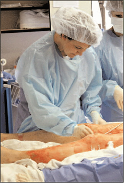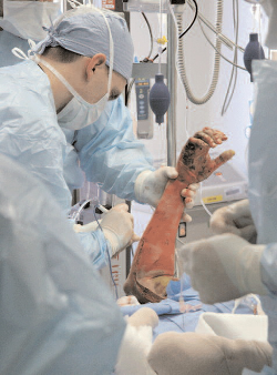 "The sounds and smells were intense," says Tuttle, adding that he "might have dropped over unconscious" if he hadn't been behind the camera. Of the nurses, who worked steadily dressing, cauterizing, and bandaging burned areas on this patient for more than two hours, he says: "The thing that amazed me was how well this team worked together. Each member stayed quietly focused on a task but at the same time was attentive to the needs of the others as well. The work itself was incredibly strenuous. It raised my appreciation for what nurses do-their teamwork, skill, and hard work[horizontal ellipsis]. At the same time, I got over my own demons." The patient, he says, survived.