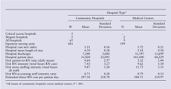 The main findings of this study support what is generally known about the differences in types of hospitals and nursing units. Academic medical centers, by their very nature, accept the sickest and most complex patients. The distribution of patient-to-RN ratios, nursing intensity, and direct RN costs across Massachusetts hospitals generally reflects this different level of care. The variability of nursing resources care is notable. In adult med/surg, nursing intensity varied from 3.2 to 9.2 hours (mean 6.2, SD 1.50) at medical centers and 1.6 to 8.6 (mean 5.1, SD 1.7) at community hospitals. Associated RN costs per patient day varied from $128 to $368 or $240 per day range and $65 to $341 or $276 per day range, respectively. In adult critical care, the RN costs per patient day range were $573 (mean $774) at the medical centers and $657 per day (mean $610) for community hospitals. Again, these are based on planned or expected staffing levels. Overall, nursing intensity and nursing direct costs of care are higher at the medical centers.