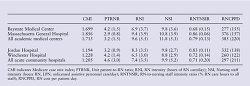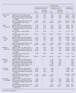 Table 2 shows the comparison between community hospitals and medical centers by unit type. There were no pediatric critical care units in the community hospitals and there was only 1 level III/IV nursery, therefore some of the table cells contain null values indicated by a minus sign.