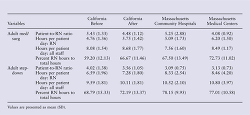 California was the first state to create a law specifying minimum nurse staffing levels in US hospitals.5,34 Donaldson et al35 have examined the effects of that legislation comparing patient-to-RN ratios, nursing intensity, staff intensity, and skill mix before and after implementation. Table 4 compares Massachusetts hospitals with those in California for adult med/surg and adult step-down units.