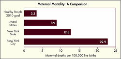 In 2002 New York State's maternal mortality rate was 12.8 deaths per 100,000 live births, while the rate in New York City was 22.9 per 100,000 live births-both rates exceed the national rate of 8.9 maternal deaths per 100,000 live births and are far above the U.S. Department of Health and Human Service's Healthy People 2010 goal of 3.3 deaths per 100,000.