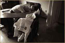 About this photograph Geiser says, "Jane used to love to paint. She and her husband, Donald, had been traveling, visiting national parks where Jane would paint landscapes, until the progression of her disease ended their trip. Now Jane is semicomatose, spending her days indoors either in a padded, reclining chair or in bed. She can no longer talk or perform any of the activities of daily life, never mind paint. Occasionally her eyes will wander around the room or she'll make an incoherent noise, but she's just a shadow of who she used to be.