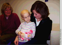 Collaboration. Kleiber, as part of her doctoral studies, was at that time conducting research on pain medications at the Children's Hospital of Iowa at the University of Iowa Hospitals and Clinics, and the two colleagues often discussed their concerns about pain management in children. Both were getting interested in pain control during other painful procedures that young oncology patients frequently endure, like iv starts, blood sample collection, and urethral catheterization. Kleiber's office was next to a treatment room where such procedures were performed routinely. "It wasn't unusual to see a parent waiting outside the room, listening to the child crying inside and looking just awful," she says. "I thought, why doesn't someone invite the parents to be with their child and tell them how to distract their child?"