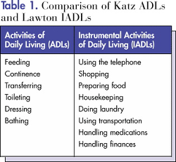 Functional assessment instruments measure ADLs and IADLs (see Table 1, page 55). Some also focus specifically on mobility, a crucial aspect of adult independence that is necessary for many ADLs and IADLs.1 The Lawton IADL scale was developed by Lawton and Brody in 1969 to assess the more complex ADLs necessary for living in the community.1-3 Competence in skills such as shopping, cooking, and managing finances is required for independent living. Because IADL function is usually lost before ADL function (such as bathing, eating, and using the toilet), assessment of IADLs may identify incipient decline-physical, cognitive, or both-in an older adult who might otherwise appear capable and healthy.3