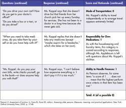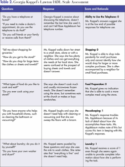 To begin, Ms. Applebaum asks whether Ms. Koppel has any formal or informal help at home. Ms. Koppel says that no one helps her but her neighbors always ask if she needs help, as do the people at her church. On Sundays, she adds, she eats lunch at church. Table 2, on page 56, shows the questions, responses, and scoring of Ms. Koppel's subsequent Lawton IADL scale assessment.
