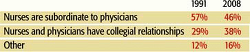 In 1991, 43% of respondents expressed satisfaction with their relationships with physicians and 56% were dissatisfied. The near reversal of these percentages after 17 years suggests that the scales have tipped in a more positive direction among nurses surveyed.