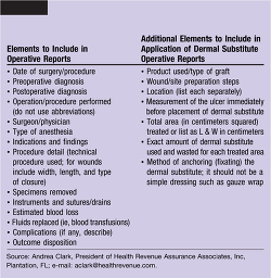 * Improve documentation. Physicians specializing in the management of chronic wounds often fail to write or dictate operative reports immediately after surgical procedures (before the patient is transferred to the next level of care), such as surgical excisional debridements (11040-11044) and applications of skin replacements and skin substitutes (15002-15431). Table 1 illustrates the elements that should be included in operative reports.