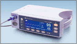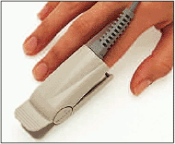 Applied to a peripheral site such as a finger, a pulse oximetry sensor consists of light-emitting diodes (LEDs) and a photodetector usually located directly opposite the light source. The LEDs transmit red and infrared light through the tissues to the photodetector, which captures changes in light absorption by hemoglobin. The monitor uses information from the sensor to calculate oxygen saturation in arterial blood and also measures average pulse rate.
