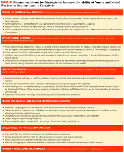 * recommending other strategies that will enhance the ability of nurses and social workers to support caregivers, including ways to change the culture of organizations, set quality measures that include family caregivers in the care delivery system, integrate technology, and enhance the public's awareness of and the education of professional and nonprofessional caregivers (see Table 4, page 10).