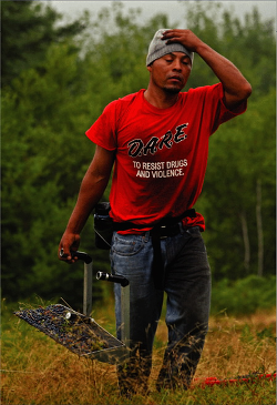 These two photographs were taken in fields and barrens owned by two large blueberry companies in Washington County, Maine. Dotter explains, "The raker in the first photograph, Miguel, is one of a nine-man Mexican crew that has returned to work the Maine blueberry harvest for many seasons. He uses a technique called sweeping; the rake's momentum pulls the berries from the thick bushes. Growers prefer rakers to use a shorter, plucking motion to prevent damage to the berries, but this means workers must spend more time hunched over.