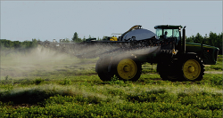 "In the second picture, a machine sprays herbicide in a remote blueberry barren early one morning. Federal law requires that warning signs be posted before such application begins and remain posted for at least two days thereafter. Yet the only notification on this occasion was the strong chemical odor coming from about half a mile down the road."