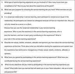 The freshmen students were already required to complete 12 hours of service-learning in their nursing course. To gather the students' descriptions, participants joined an online asynchronous discussion group and reflected weekly to questions (Figure 1) I posed as well as to each others' responses. The study ran for 6 weeks, with 2 of the weeks' questions directly addressing reciprocity and the affective domain of learning. The other 4 weeks' questions were specific to the nursing course. This allowed students to complete the study and course reflective component at the same time. Participation was entirely voluntary, and any student who chose not to participate completed the course requirement for reflection as outlined in the course syllabus.