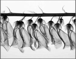 X-ray exposures are sensitive enough to reveal the density of a subject, and Meyers continues to unveil the intricacies and beauty of botanical specimens in this still somewhat unexplored medium. "I often give myself problems to try and solve, like how to create distance or depth with a radiographic X-ray exposure," he explains. "The depth of field with the equipment I use is about an inch. All objects must fit on an 8" x 10" or 10" x 12" sheet of film-that's the largest I can expose. Because X-ray film was never intended to be enlarged, having a big negative is a bonus."