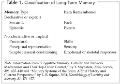 There are several ways to classify memory (Table 1). Short-term (working) memory and long-term memory constitute the most basic classification (Miyashita, 2004). Long-term memory is divided into declarative and nondeclarative forms. Declarative memory, also called explicit long-term memory, is subdivided into semantic memory and episodic memory (Miyashita; Squire, 2004). Declarative memory is the conscious, intentional recognition of previous experiences, including facts (Kolb & Whishaw, 2003). Semantic memory involves remembering factual knowledge, including learning text, phone numbers, or trivia. Episodic memory is memory associated with events, locations, or circumstances.