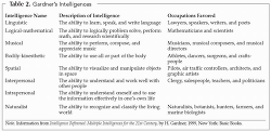 Gardner (1983) recognized that different areas of the brain are responsible for different competencies. He labeled these competencies as different intelligences that we all possess to varying degrees. Gardner (1999) updated and slightly expanded the original list of multiple intelligences. He derived his theory from multiple sources, including personal musical experience, observations of gifted individuals, and evidence from experimental psychology and neuroscience. These intelligences are linguistic, logicalmathematical, spatial, bodily-kinesthetic, musical, interpersonal, intrapersonal, and naturalist (Table 2). Gardner noted that traditional IQ tests measure only a limited amount of our human potential, primarily logical-mathematical intelligence, with some testing of spatial and linguistic intelligences. Musical, bodily-kinesthetic, and intrapersonal intelligences are not measured on traditional IQ tests.
