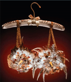 At the February 2008 meeting, Baker challenged members to participate by making "an artful bra." The idea was a hit: at a retreat the following October, members presented their beautiful, comical, and elaborate designs with names like Thelma and Louise (A Pair of Perky Hooters), for a bra in an owl motif (on this page); For Those Who Served, for a bra made of camouflage fabric; and Girls Divided, for a sports bra with soccer ball and softball cups.