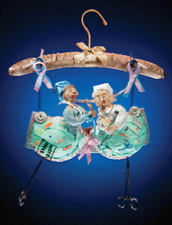 About Nursing Bra, designer Anne Duncan, a former nurse, writes that both "Bar-bra (the surgical nurse) and Deb-bra (the traditional nurse)" are hand-sculpted and painted. "They represent the nurses who have given their time, talent, and love for many breast cancer patients," Duncan writes. She used surgical masks to create the cups, scrubs and surgical suture to make the back, and oxygen tubing to make the stethoscopes that serve as straps. "This bra honors the nursing profession for which I have proudly been a part for over 35 years."