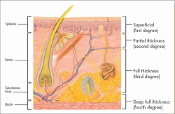Superficial burns, which are unblistered, and partial-thickness burns (also known as first- and second-degree burns) are extremely painful. In a partial-thickness burn, the outermost skin layer (epidermis) and the uppermost third of the underlying skin layer (dermis) are damaged, and peripheral nerve endings become exposed in the damaged dermal layer. A full-thickness burn (also known as a third-degree burn) results in complete destruction of both the epidermis and the entire dermis. A deep full-thickness burn (also known as a fourth-degree burn) extends past the dermis into underlying subcutaneous tissue, muscle, and bone. (See Figures 1 and 2.) Even after the skin is no longer in contact with the source of the heat, skin damage can continue as a result of protein denaturation (changes in the three-dimensional structure of the protein molecules). Without adequate assessment and initial treatment-for example, if fluid resuscitation is inadequate or hypoxia occurs-deep partial-thickness burns can convert to full-thickness burns within 24 hours of injury.5