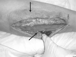 Necrotizing fasciitis wounds are extensive and often involve tissues with a higher content of potentially pathogenic organisms. These wounds may be seen in body parts, such as the digits of the hands and feet, the legs and abdomen, and the perineum (Childs, 1999). Extensive surgical debridement of necrotic tissue is often needed to prevent the spread of infection and to salvage the limb. Fasciotomies (division of the fascia surrounding a muscle compartment to relieve pressure) are performed in extremities with compromised viability (Maynor, 2006). These incisions are then left open to heal by secondary intention rather than primary closure. As disfiguring and emotionally distressing as it is, a fasciotomy may be a limb-saving procedure.
