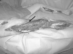 Over the course of the next 3 weeks of her hospitalization, H. S. underwent three serial surgeries, which involved extensive circumferential, bilateral lower extremity debridements, complex closures of the wounds, split-thickness skin grafting, and wound V. A. C. application. A peripherally inserted central catheter was placed to administer intravenous antibiotics (see Figures 1-3).