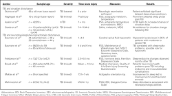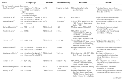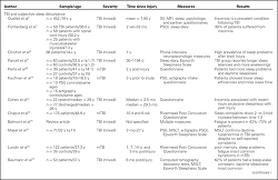 For this review, PubMed and Ovid/MEDLINE databases were searched by using the following key words: "sleep disturbance," "insomnia," "TBI," "brain injury," and "circadian rhythms." Each key word was crossed with the others and the abstracts of manuscripts resulting from this search were reviewed by the first author. The review was limited to those studies that focused specifically on sleep and TBI. Note that many of the studies reviewed included patients with TBI of varying severities, and they typically did not report results separately for each severity type. Intervention studies were included provided that the primary aim of the study was not limited to comparing effectiveness of pharmaceutical agents. Additional studies were sourced from abstracts from the Associated Professional Sleep Societies meetings and published in the journal Sleep over the past decade. Also, only articles published in English language journals over the past decade (since 1997) and those that could be searched electronically were included in the review. In all, 33 articles met these criteria and were selected for this review (Table 1). Articles were later grouped by domain of inquiry for easier synthesis and readability. While it is possible that some studies were missed with this search method, this review provides a broad overview of the current state of knowledge regarding sleep disturbance and its relation to TBI and recovery.