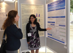 Glucose variability refers to the "swings" in blood glucose levels that one has in a given day. Irl Hirsch, an endocrinologist from Seattle, suggested that high glucose variability may be an independent risk factor for microvascular complications and more detrimental in people with diabetes than chronic hyperglycemia. Boris Kovatchev, of the University of Virginia, discussed the assessment and clinical relevance of glucose variability. He uses data on continuous glucose monitoring along with daily blood glucose monitoring to identify glucose fluctuations and stratify the risk of developing diabetes complications over time. As more insurance companies reimburse patients for continuous monitoring supplies, many patients and providers will be able to examine round-the-clock glucose trends and stop basing clinical decisions on the limited information obtained from glucose meters. Pictured here is Neesha Ramchandani, PNP (right), presenting a poster to a participant at the conference.