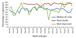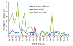 The TCAB pilot units also measured the number of codes per month. No published benchmark was available from the literature, and the TCAB goal was zero. Eight of the 10 pilot sites had no codes for six consecutive months or longer. The average number of codes decreased 33% between 2005 and 2007. Figure 3 shows average performance on all units and the performance of the pilot unit that achieved the best results.