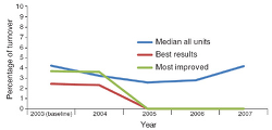 Results. The outcome measure for team vitality was voluntary nurse turnover. Published evidence shows that annual voluntary nurse turnover ranges from 8% to 14%.2, 3 The desired turnover rate on the TCAB pilot units was 5% or less. The pilot units generally maintained that goal throughout the four years of the project. The median nurse turnover decreased from 4.22% in 2003 to 2.56% by the end of 2005. Although it remained within the target of 5% or less per year, turnover across all units increased to 2.78% in 2006 and 4.17% in 2007 (see Figure 4).