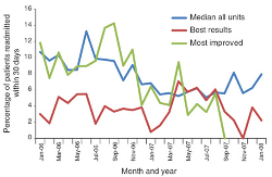 Another measure of patient-centered care was readmission rates within 30 days of discharge. Published evidence from the Medicare database indicates that the average 30-day readmission rate is approximately 20%.16 The goal for TCAB units was 5% or less, and four of 10 pilot sites reached this goal. The average rate of readmissions within 30 days decreased 29% between 2006 and 2007. In a particular month, the range of readmission rates among all pilot units was 0% to 23.4%. Figure 6 shows the median 30-day readmission rate and outcomes on the TCAB units that had the best results and made the most progress over time.