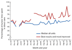 Results. The outcome measure for evaluation of value-added care processes was the amount of time that nurses spent providing direct patient care. According to published evidence, medical-surgical nurses spend between 20% and 30% of their time caring for patients; the rest of the time nurses are engaged in other activities, such as documentation, finding supplies and other members of the care team, and care coordination.18 The TCAB goal of 70% of time spent on direct patient care was met by only one of 10 pilot units measuring this outcome. Nevertheless, most nurses on the TCAB pilot units spent twice as much time on direct patient care after TCAB was initiated. Nurses' time providing direct patient care averaged 47% in 2005, 48.6% in 2006, and 49.6% in 2007. Quantitative results for this measure are shown in Figure 7. The unit that achieved the best results also made the most progress over time.