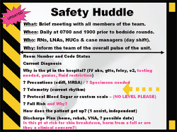 In our brainstorming about how to improve the shift report, we came up with the idea of having a team huddle, which we dubbed a safety huddle. This five- to 10-minute gathering at the beginning of shift change replaced the brief taped report delivered behind the closed doors of the conference room and gives us the information we need to work as a team. Both shifts assemble at the central nurses' station and the off-going staff succinctly report the critical information on each patient that everyone needs to know, including code status, diagnosis, tests scheduled for the day, fall risk, safety issues, and plan for the day (see Figure 1). We also review educational opportunities, such as in-services, that are offered that day. The on-coming and off-going nurses then head to the bedsides for the detailed reports.