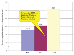 Anecdotally, nurses have reported an increased feeling of collaboration with physicians and a sense that their input is valued. Annual surveys of the nursing staff show increased satisfaction with their working relationship with physicians, from 78% reporting satisfaction in 2006 (before intentional rounding) to 91% in 2008 (see Figure 2).