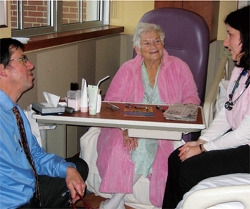 When a physician arrives on the unit, she or he checks the board to see which nurse is caring for the patient. The physician reviews the patient's chart and then uses the computerized Hill-Rom nurse locator system to pinpoint the nurse's location on the unit. Together the nurse and physician enter the patient's room, assess the patient, and review any test results. The nurse, physician, and patient review the care plan, upcoming tests, and the potential discharge date. The providers discuss the goals for the day and answer the questions of the patient and family.