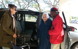 Simms was given a cell phone so that patients could call him from the parking lot when they were ready to be escorted. (Patients who don't have a cell phone call before they leave home.) Simms learned each patient's automobile model, color, and license plate number. A bench where family members could drop off patients to wait for Simms was strategically placed outside the hospital.