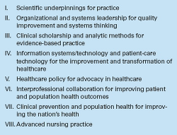 In addition, programs adhere to the "essentials of doctoral education for advanced practice nursing" (commonly known as the "DNP essentials"). These standards identify foundational curriculum content and outcome-based competencies essential for all students pursuing the DNP degree, regardless of specialty or focus (see The essentials of doctoral education for advanced nursing practice).17