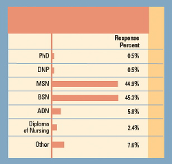 Twenty-six percent of us are currently attending school. Of this group, 42.5% are working to attain a master's degree in nursing, 4.8% a master's degree in business administration, 8.6% a PhD, 5.4% a DNP, and 19.7% a BSN. Over 20% are working toward the following degrees: EdD, MHA, MPH, DNS, DM, or post-master's certificates. It's evenly split between those going to school either full or part time.