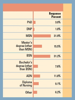 Despite recommendations from this report, 47.3% of us believe that the entry level into practice should be at the associate or diploma level of education. Interestingly, the older the respondent, the greater the preference for baccalaureate entry levels. Nearly 59% of you older than 55 and more than 62% of you older than 60 affirm that a BSN should be the minimal requirement.
