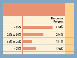 Of our 2,868 respondents, 93.2 % are women, 87.1% are older than 45, and an overwhelming majority (83. 4%) are Caucasian. Seventy-seven percent of you have been in your current position for less than 10 years; 44.3% of you hold the position of nurse manager, director, or vice president; and a large majority (69%) of you have been in nursing more than 20 years. The largest percentage of respondents are from the East North Central region of the country (17.5%), followed by South Atlantic (16.9%), Middle Atlantic (15.3%), West South Central (10.3%), Pacific (9%), West North Central (8.2%), Mountain (7.2%), New England (5.5%), East South Central (4.7%), and Canada (1.8%). The remainder (3.7%) of you represents Greece, the Netherlands, the Philippines, the United Kingdom, Australia, Puerto Rico, Kenya, and Iran.