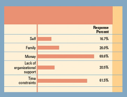 Money is the largest barrier to returning to school. Seventy percent of respondents who want to go back for a higher degree can't because of financial concerns. Other barriers included family issues, lack of organizational support, time constraints, older age, and lack of financial incentive to attain the degree.